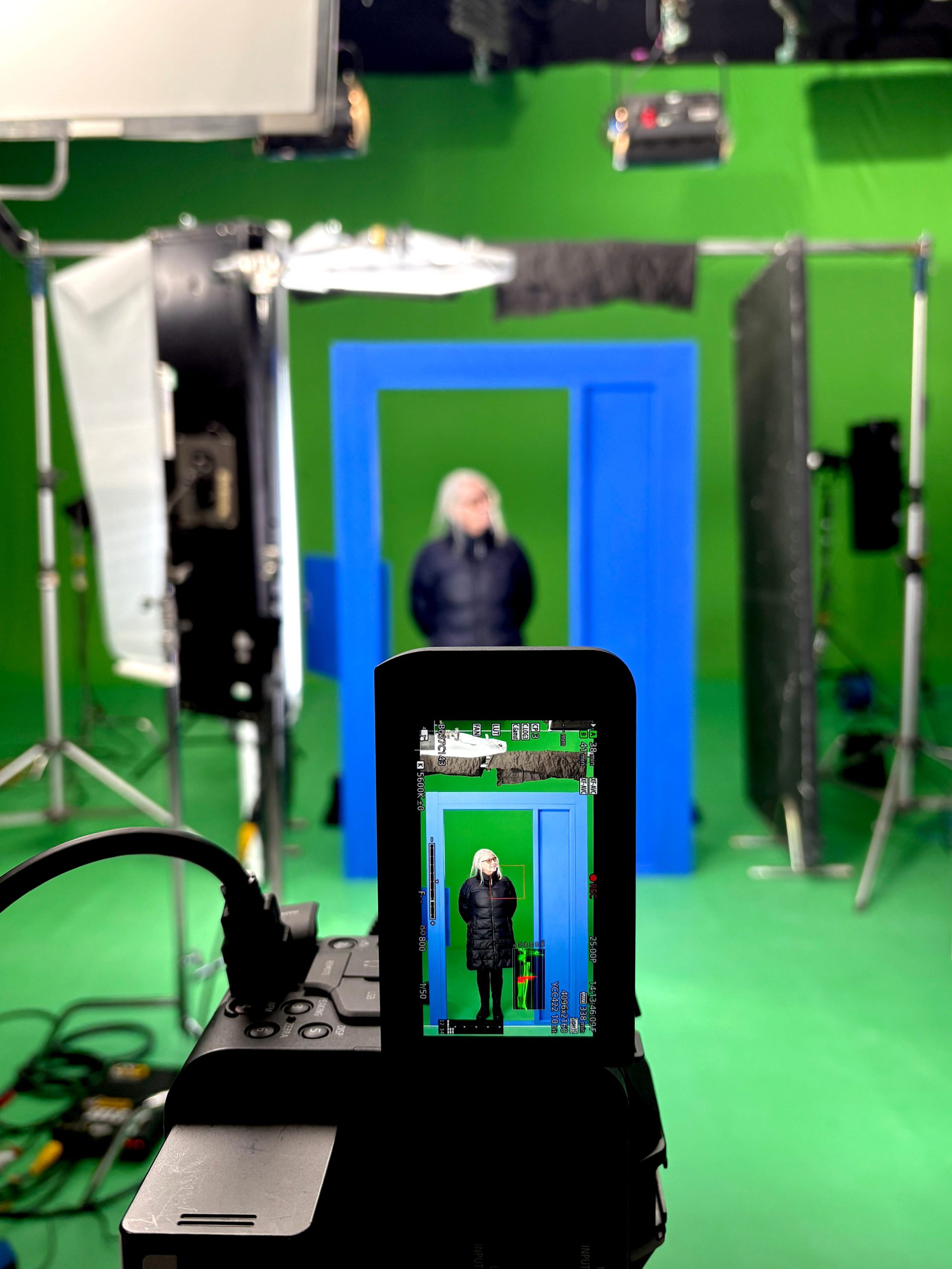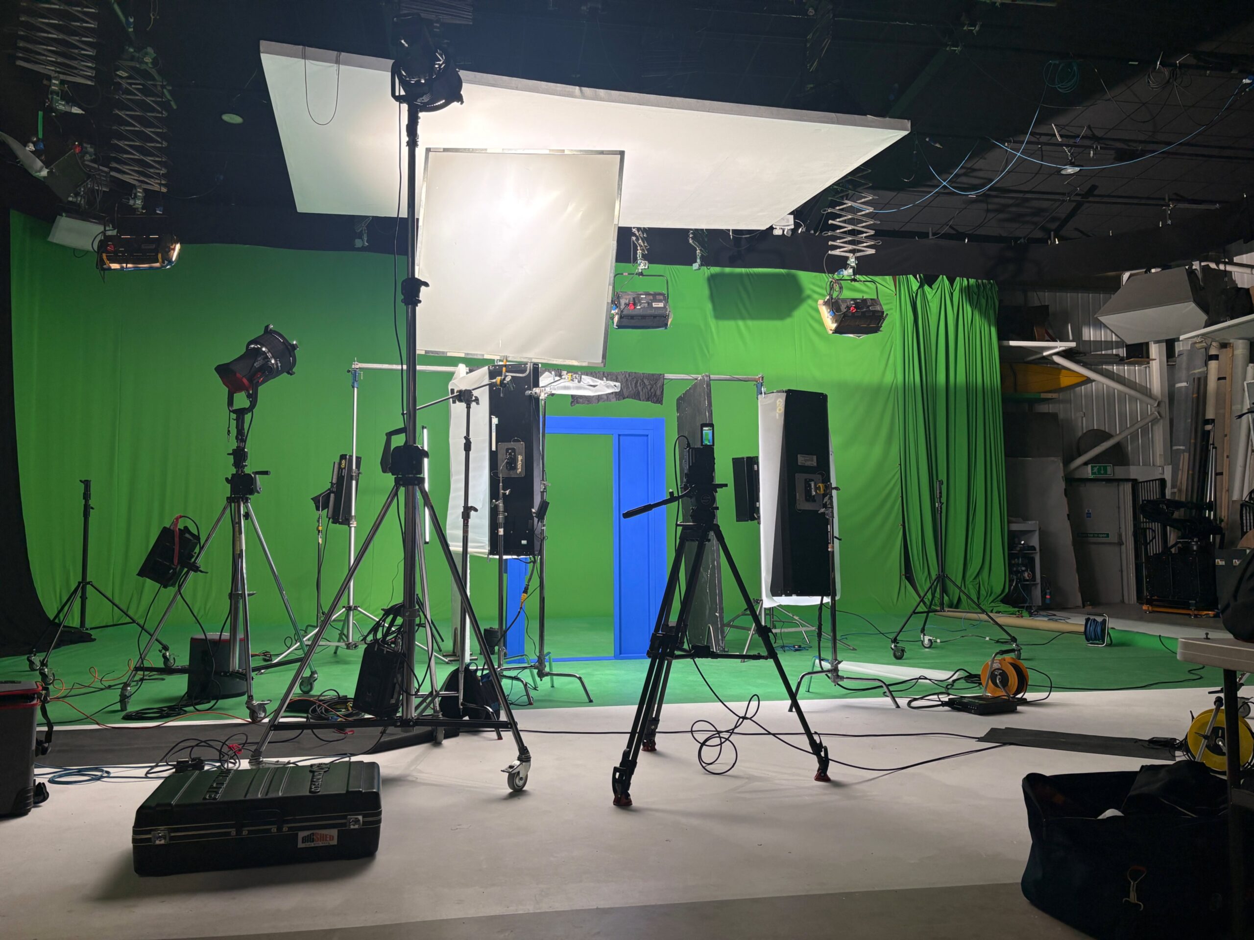Two presenters standing in front of a green screen in a video production studio, surrounded by lighting equipment and cameras.